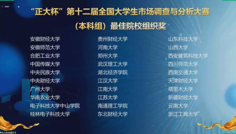 2022年5月28-29日,由中国商业统计学会主办的“正大杯”第十二届全国老员工市场调查与分析大赛本科组总决赛在江汉大学举行,来自全国各地126所高校的优秀团队参加比赛。经过报告评审和现场展示,公司3支团队荣获国家一等奖,9支团队荣获国家三等奖,公司荣获最佳院校组织奖。