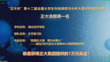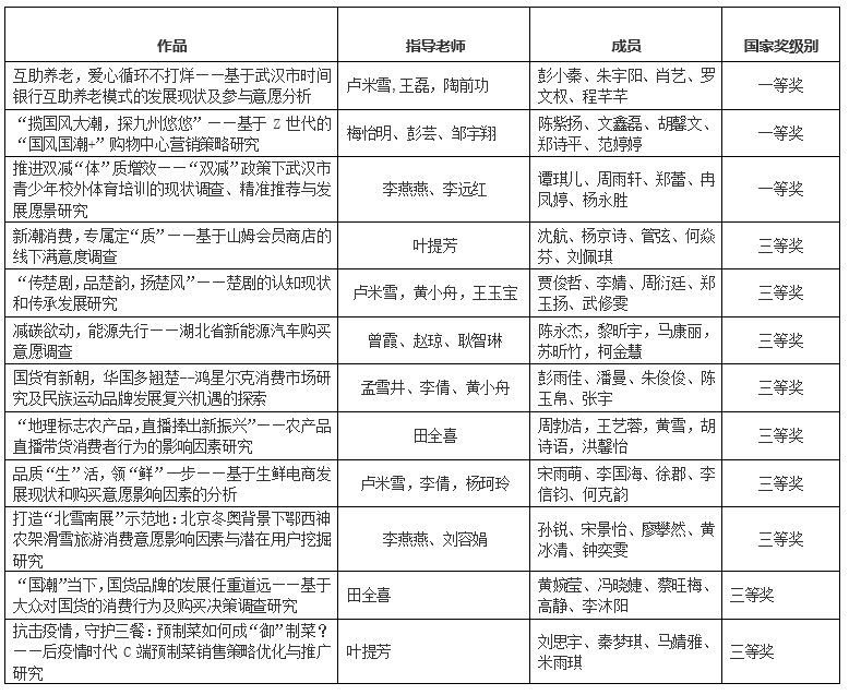 其中,由梅怡明、彭芸、邹宇翔指导的《“揽国风大潮,倾九州君心”——面向Z世代的正大购物中心营销策略研究》(团队成员:陈紫扬、文鑫磊、胡馨文、范婷婷、郑诗平)荣获国家一等奖,并且在正大选题组中荣获全国第一名。卢米雪、王磊、陶前功指导的《互助养老,爱心循环不打烊——基于武汉市时间银行互助养老模式的发展现状及参与意愿分析》(团队成员:彭小秦、朱宇阳、肖艺、罗文权、程芊芊)和李燕燕、李远红指导的《推进双减 “体”质增效:“双减”政策下武汉市青少年校外体育培训的现状调查、精准推荐与发展愿景研究》(团队成员:谭琪儿、周雨轩、杨永胜、郑蕾、冉凤婷)均获国家一等奖。