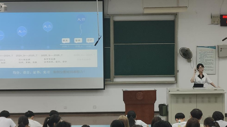 本网讯(通讯罗洋韬 审核张澈)为帮助大一同学做好科学制定学业发展规划,培养国际化视野,深入了解出国(境)留学相关政策,球速体育于5月12日在J3-105面向大一年级开展留学规划讲座,讲座由大一年级辅导员张澈老师主持,全体大一员工参加。