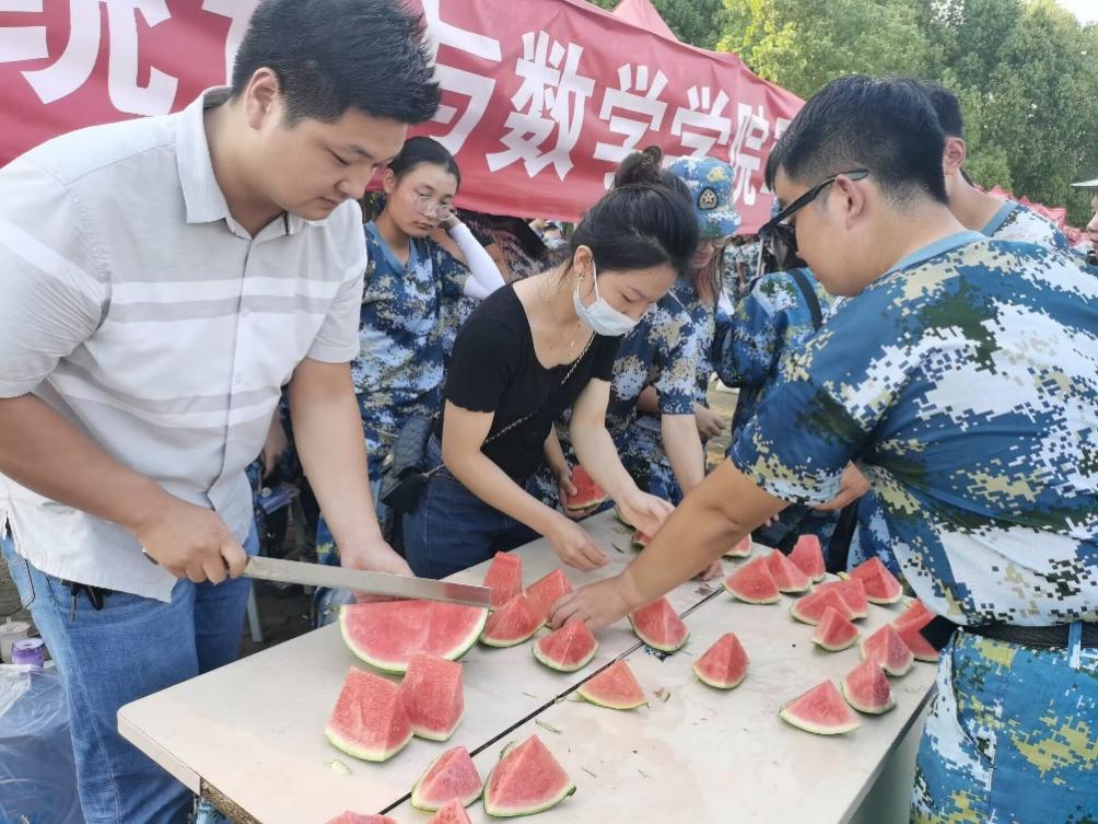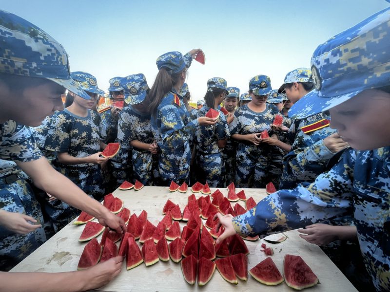 随后院领导为全体参训员工分发西瓜。让同学们感受到公司的关怀和鼓励,激发了同学们的军训热情,同学们都纷纷表示要战高温、抗酷暑,不怕苦、不怕累,全力完成军训教官们下达的各项任务。
