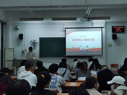 第三板块为“请党放心,强国有我”,四位宣讲人从社团活动、学科竞赛、社会实践等方面向大家分享了提升自我的途径,希望同学们不忘初心,砥砺前行。