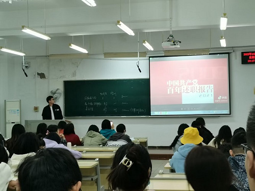 本次宣讲活动以“青春心向党,建功新时代”为主题,分四个板块进行演讲。第一板块为“峥嵘岁月,强国历程”,四位宣讲人从中国共产党的成立开始,为同学们介绍了新中国的发展史,并播放视频《中国共产党百年述职报告》,使同学们进一步了解中国共产党从红船启航到如今党的二十大即将召开的光辉历程。