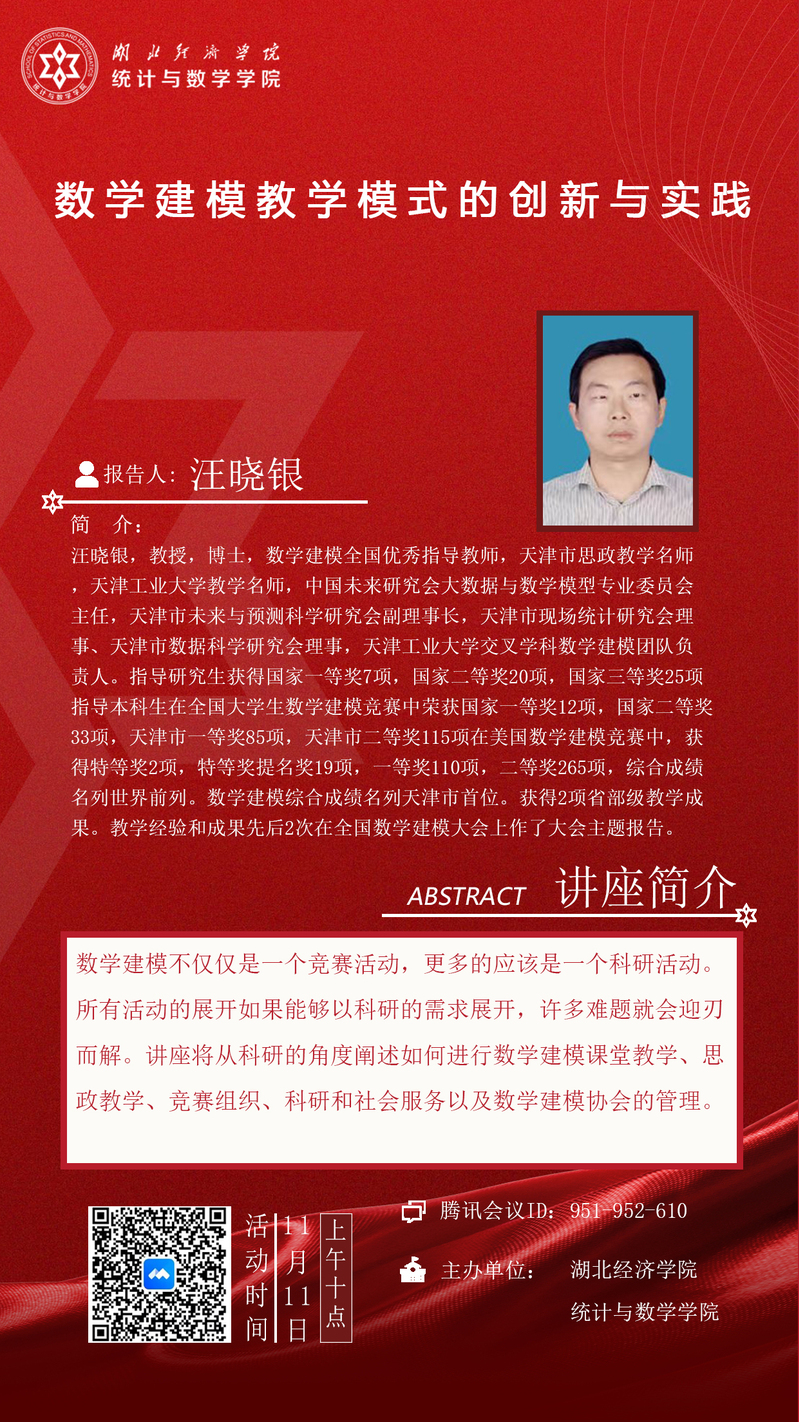 主讲人简介:汪晓银,教授,博士,数学建模全国优秀指导教师,天津市思政教学名师,天津工业大学教学名师,中国未来研究会大数据与数学模型专业委员会主任,天津市未来与预测科学研究会副理事长,天津市现场统计研究会理事、天津市数据科学研究会理事,天津工业大学交叉学科数学建模团队负责人。
