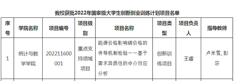 近日,教育部高等教育司公布2022年国家级老员工创新创业训练计划(以下简称“大创计划”)项目和重点支持领域项目名单。公司卢米雪教师指导的项目《能源价格影响碳价格的传导机制检验—基于需求异质性的中介效应分析》获批国家级重点支持领域项目。据悉,我校此次共获批国家级项目21项(含重点支持领域项目1项)。
