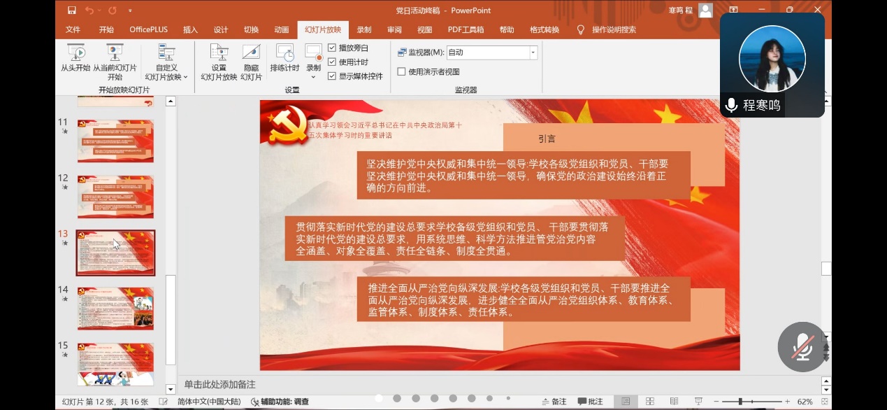 活动第一项,深入学习领会习近平总书记关于全面加强党的纪律建设的重要论述。程寒鸣同志带领各位同志从为保持党的先进性,加强党的纯洁性,提升党的执政能力,维护党的团结统一四个方面对习近平总书记关于全面加强党的纪律建设的重要论述进行深入学习。广大党员同志必须提高自身素质,积极参与国家建设,遵守法律法规,弘扬民族精神。