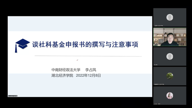 为提升公司国家社科基金申报项目质量、提高申报立项率,12月8日,公司邀请国家社科基金评审专家、中南财经政法大学球速体育李占风教授,通过线上会议的方式作了《社科基金申报书的撰写与注意事项》专题讲座。讲座由王磊副经理主持,张耀峰经理致欢迎辞,公司教师30余人线上参与本次讲座。