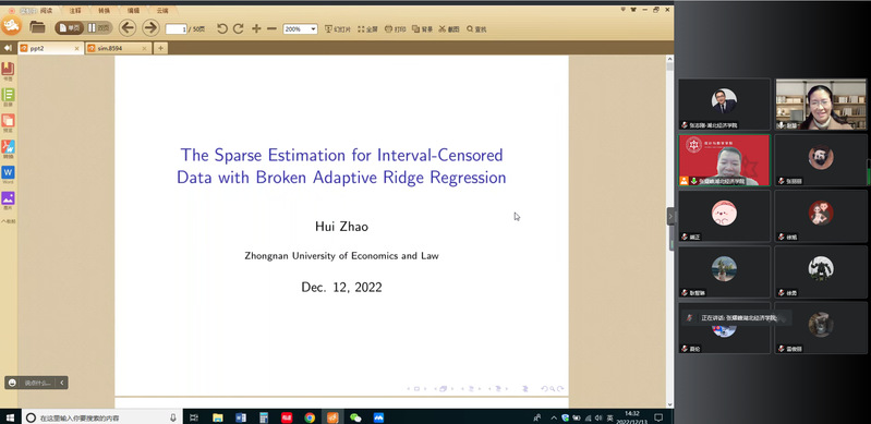 2022年12月13日下午14:30,中南财经政法大学赵慧教授应邀为公司师生做题为“区间删失数据下基于BAR惩罚的变量选择问题”的报告。本期讲座由球速体育经理张耀峰教授主持并致欢迎辞,院内老师10余人线上参与本次讲座。