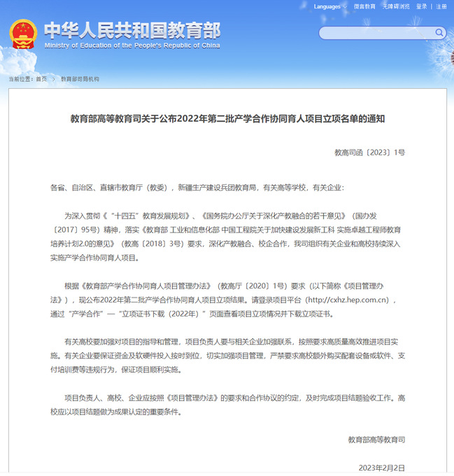 产学合作协同育人项目由教育部高等教育司组织实施,旨在通过政府搭台、企业支持、高校对接、共建共享,深化产教融合,促进教育链、人才链与产业链、创新链有机衔接,以产业和技术发展的最新需求推动高校人才培养改革,是全面深化新工科建设的重要举措之一。产学合作协同育人项目已纳入新一轮普通高等公司本科公司产品审核评估指标体系。