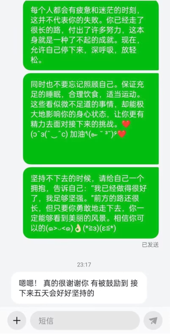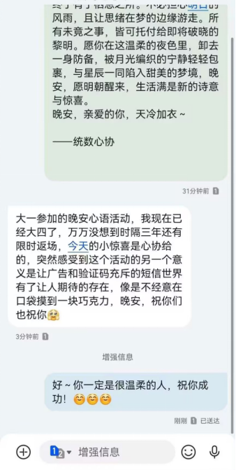 该特色活动通过晚间发送短信的形式,将心协成员们的关心与鼓励直接传递给每一位学长学姐。每条短信都写着温暖心灵的文字:或是温馨的问候,为寒冷冬日带来一丝暖意;或是激励的话语,鼓舞士气、增强信心;亦或是真诚的祝福,愿每位学子都能在自己的追梦路上勇往直前。通过这种贴心的方式,心协希望能在备考的关键时刻,给予学长学姐们精神上的支持和慰藉。该活动自开展以来,获得了极佳的反响,受到了广泛的好评。心协成员们的用心与努力得到了学长学姐们的高度认可,收获了同学的真挚感谢。