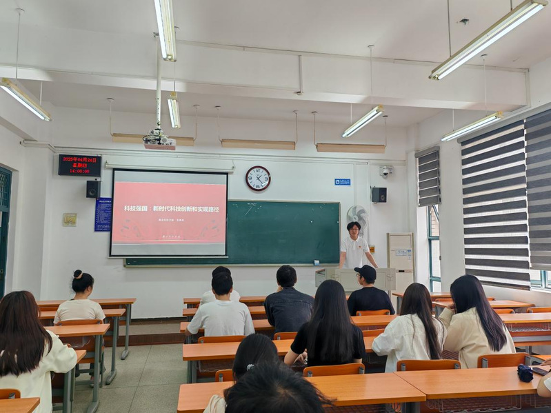 在“科技强国”主题宣讲环节,张海滔以“新时代科技创新和实现路径”为主线,以“科技创新的内涵与分类”为切入点展开宣讲,让同学们对科技创新有了更深入的了解。在“科技创新的挑战”部分,他结合国际竞争格局,分析了我国在关键核心技术(芯片、高端装备)领域的“卡脖子”问题,强调“科技自立自强是必由之路”。随后,在“科技创新的成就”板块,张海滔结合电影《哪吒》和deepseek为实例,以翔实数据展示了我国近年来的重大突破。围绕“科技创新的实践路径”,张海滔提出三点青年策略。他强调,作为青年学子应夯实专业基础,培养创新思维,积极参与科研实践,为加快建设科技强国贡献智慧与力量。