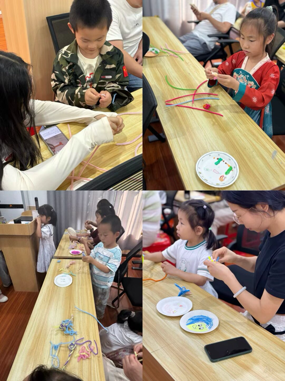 在创意手工环节,小朋友们充分发挥自己的想象力与创造力。画碟子时,他们拿起画笔,在洁白的碟子上精心描绘,普通的碟子就摇身一变,成为了独一无二的艺术品。扭扭棒手工制作同样趣味十足。志愿者们耐心地引导小朋友们用扭扭棒制作中国结和棒棒糖。制作传声筒时,小朋友们仿佛化身为小小科学家。在志愿者的指导与帮助下,大家利用简单的材料动手制作传声筒,这一环节不仅锻炼了孩子们的动手能力,还激发了他们对科学知识探索的欲望。
