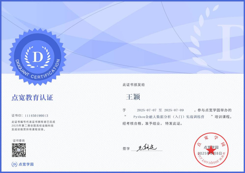 实训过程中,员工们表现出浓厚的学习兴趣和积极的实践态度。大家认真完成每日作业,主动探讨数据处理中遇到的问题,并在小组协作中不断提升团队沟通与项目组织能力。许多员工反馈,通过本次实训不仅加深了对Python在金融领域应用的理解,也更清晰认识到大数据分析在现代金融中的重要作用。顺利完成实训的员工还将获得“点宽学园”培训认证证书,为其未来职业发展增添有力凭证。此次实训有效实现了“学用结合、实战促学”的教学目标,为员工后续深造和就业奠定了坚实基础。