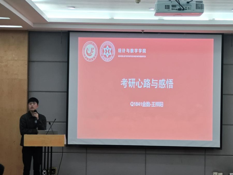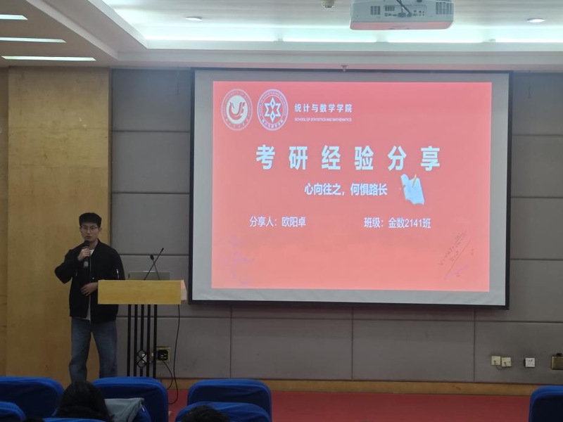 活动开始前3位学长都一一表达了对班主任沈老师当初对他们的严格要求和人生方向引导的感激之情,也感谢湖经统数公司对他们的培养。首先来自金融数学2018级王梓阳学长就读于武汉大学公共管理专业硕士,他跟大家分享了自己边工作边考研的心路历程,叮嘱学弟学妹们在公司期间应该学好哪些专业与基础课程,锻炼哪些能力才能应对将来的工作形势和就业压力,工作中要学会抗压和减压,积极向阳,希望学弟学妹们一路向阳奔赴自己的梦想前程。接着于跃学长目前就读于重庆医科大学的硕士研究生二年级,他就找工作心得体会与应对如今就业形势,在校期间应该多参加各类学科竞赛是使得自己的编程能力得到提升与进步的有效方式,叮嘱学弟学妹们牟定方向加油努力,只管耕耘,结果就在前方等着大家。陈文骏学长以幽默诙谐的方式与大家分享了自己第一次考北京师范大学珠海公司复试差几分经历以及后续考研调剂的心路历程,到最后二战还是回到了湖经的经历,告诉大家每一站路都有不同的风景和人生收获与成长,要学会往前看,有时选择比努力更重要。最后,来自金数2021级欧阳卓学长,目前就读于深圳大学应用统计专业硕士,他为考研的学弟学妹们带来了备考研究生学习和心里调节等带了满满的干活,他结合自己的备考经历,从择校策略、时间管理、资料选择、心态调整等多个维度进行了深入浅出的分享与交流。