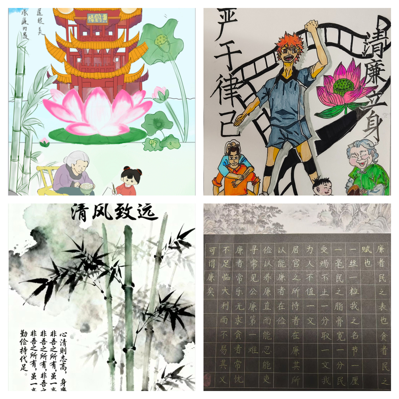 在“我家的清廉家规家训”作品征集活动中,参与者围绕“清廉家规家训”主题创作电子海报、漫画或书法等形式的文艺作品。同学们以书法、绘画、海报等多元形式,展现家乡特色与家庭文化,传递“清廉传家”的价值理念。该活动中共有8件作品获评优秀并在公司集中展示,成为校园中一道传递“廉能量”的风景线。