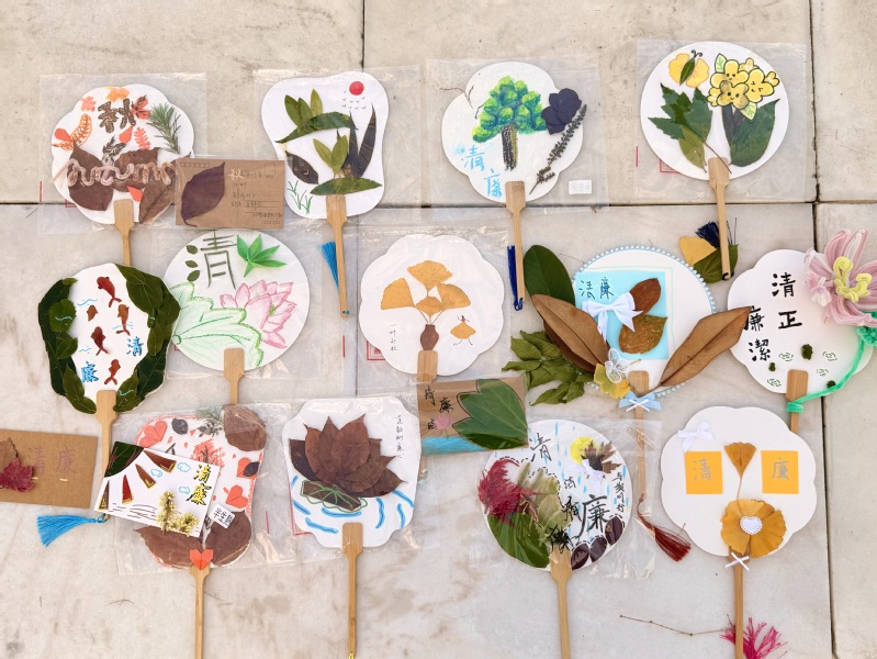 “清风拾秋”手工工作坊连续举办多场,每场招募20人。同学们以秋日自然元素为媒介,通过清廉扇面绘画、主题明信片制作等形式,将落叶、树皮等素材与象征高洁的梅兰竹菊、莲花等图案相结合,创作出一批寓意“清正廉洁”“淡泊明志”的文创作品。活动现场创作氛围浓厚,同学们在动手实践中体会“以物喻廉”的深刻寓意,将抽象的廉洁理念转化为具象的艺术表达。