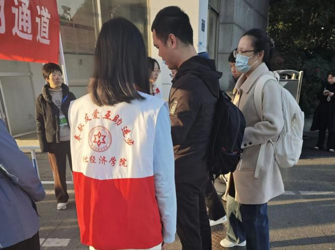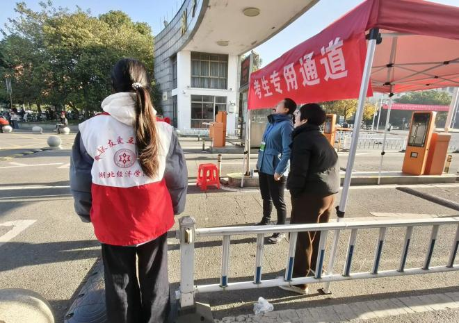 活动当天,志愿者们提前抵达考点,迅速明确分工、各就各位。在检录通道,志愿者们耐心引导考生有序排队,确保检录流程高效顺畅;在校园周边路口,志愿者们积极开展交通疏导工作,引导送考车辆规范停靠、即停即走,避免交通拥堵影响考生入场。