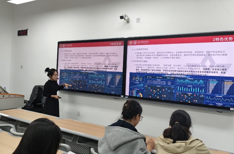 宣讲过程中,团队成员围绕公司办学特色、公司发展历程、应用统计硕士点优势等核心内容展开详细介绍。重点解读了硕士点两大研究方向——社会经济统计、大数据分析方法与应用的培养特色,展示了公司雄厚的团队力量、丰富的科研成果及产教融合优势。同时,针对考生关心的考试科目、复试安排、学制学费、奖助体系等关键问题,宣讲教师结合公司研究生奖助政策进行精准答疑,并分享备考经验与择校建议。