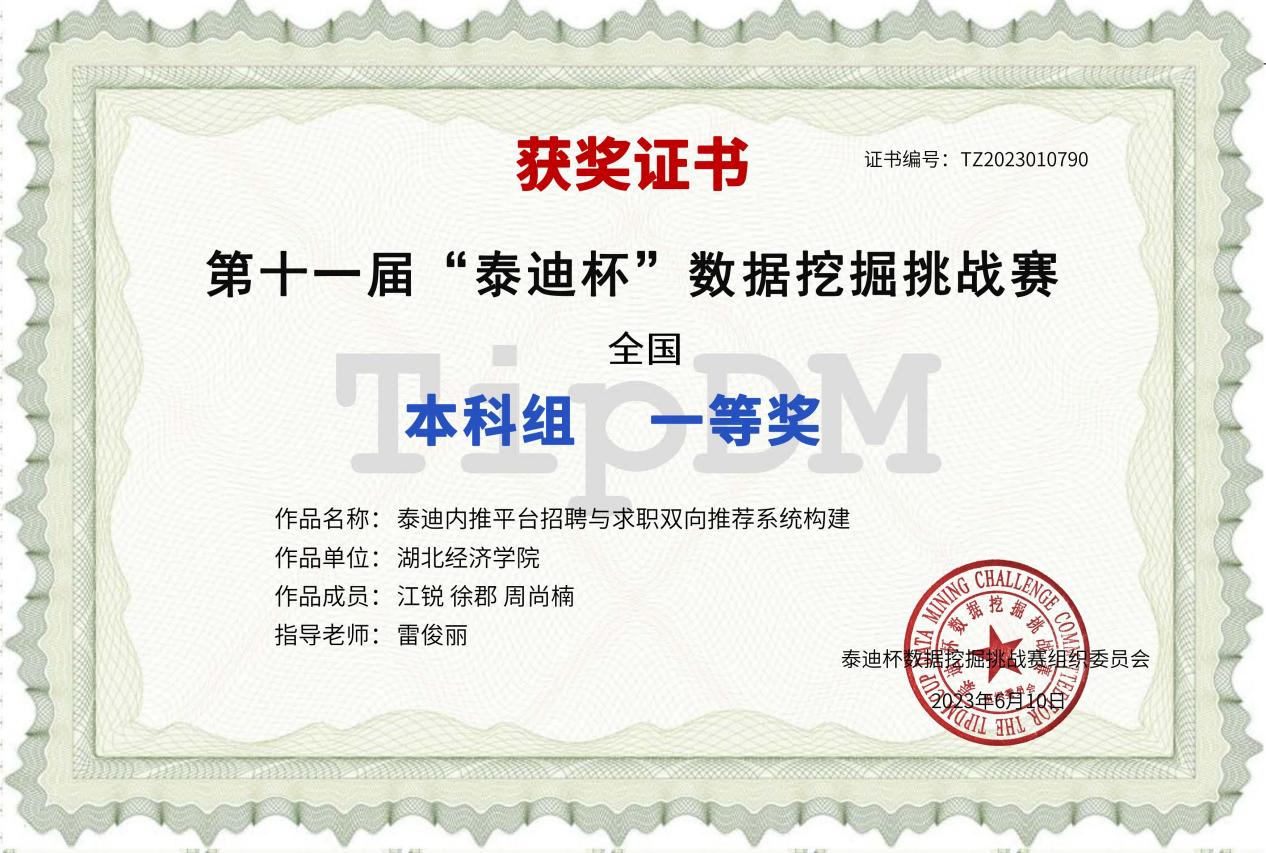 日前,2023年全国高校数据科学实践教学研讨暨第十一届“泰迪杯”数据挖掘挑战赛颁奖会在广东惠州隆重举行,由公司数据科学与大数据技术专业员工徐郡、周尚楠、江锐组成的参赛队伍脱颖而出,获得本届“泰迪杯”全国一等奖(全国3811支队伍仅50支本科生队伍可获一等奖)。此外,公司还获得全国二等奖2项、三等奖5项,湖北省一等奖1项,二等奖3项,三等奖6项,公司获得“最佳组织奖”。指导教师为张耀峰、张志刚、王磊、雷俊丽、胡凡、李明磊、沈卉卉、徐旭、王东红等。
