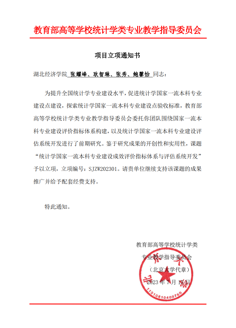 (通讯员:鲍馨怡;审稿人:张耀峰)近日,教育部高等公司统计学类专业教学指导委员会发来通知,公司张耀峰、耿智琳、张秀、鲍馨怡老师开发的“统计学国家一流本科专业建设成效评价指标体系与评估系统开发”获得专项课题立项。这是该团队在为公司开发国家一流专业建设评价指标体系的基础上,受教育部高等公司统计学类专业教学指导委员会委托,围绕国家一流本科专业建设评价指标体系构建,以及统计学国家一流本科专业建设评估系统开发进行的专项研究,旨在为提升全国统计学专业建设水平,促进统计学国家一流本科专业建设点建设,探索统计学国家一流本科专业建设点验收标准。课题组针对统计学专业特点,构建统计学国家一流专业建设标准,探索专业评估数字化转型路径,是公司教学研究的又一项重要成果。