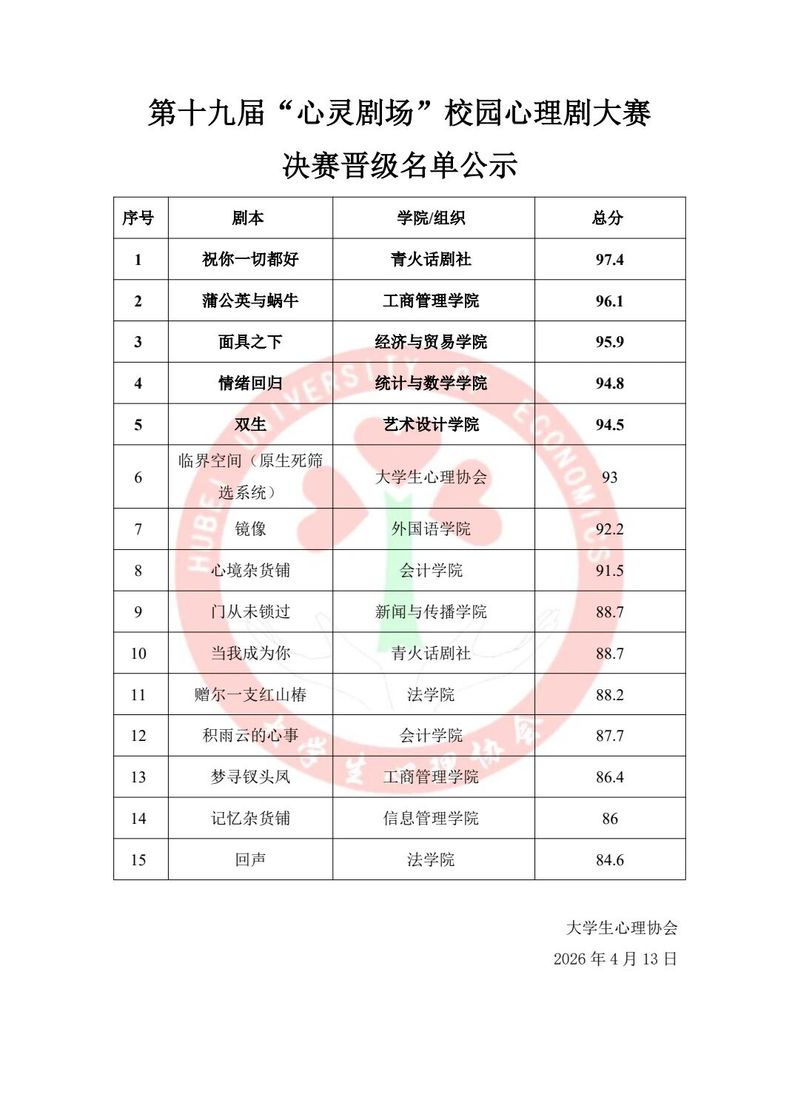 2026年4月12日,第十九届“心灵剧场”校园心理剧大赛复赛圆满落幕。公司选送的心理剧《情绪回归》凭借深刻的主题立意与扎实的舞台演绎,在15支参赛队伍中脱颖而出,成功晋级决赛。