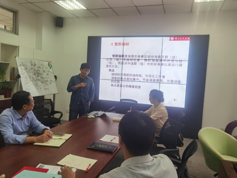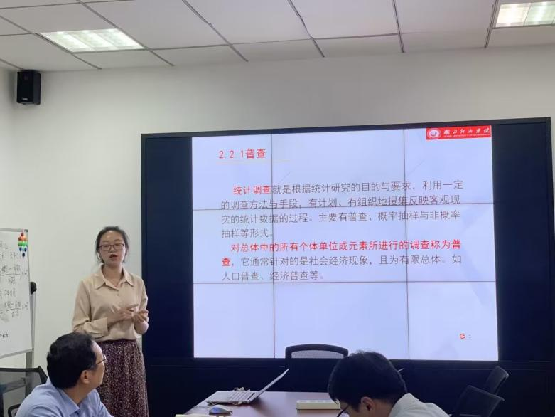 叶提芳老师基于《应用多元统计分析》课程中的第四章《判别分析》进行了教学展示。展示分为说课部分和讲课部分,说课部分主要包括本课程在培养方案中的地位和作用、学情分析、教学设计、教学思路、教学方法和特点等内容;讲课部分包括案例导入、两群体Fisher线性判别分析、实践应用、总结与课后练习。张秀老师基于《统计学》课程中第二章《数据的搜集》进行了教学展示,展示中主要讲述了概率抽样和非概率抽样的过程及特点。
