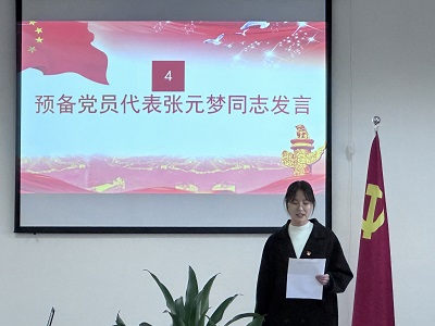 第四项,预备党员代表发言。张元梦同志代表全体预备党员发言,首先,向公司党委和各位老师表示衷心的感谢。其次,强调了入党动机端正的重要性,表示要在思想上真正入党,并将党的思想作为行动指南。张元梦同志承诺将不断提升自己的思想政治修养,全心全意为人民服务,并树立终身学习的观念,以实际行为履行誓言,为党旗争辉。