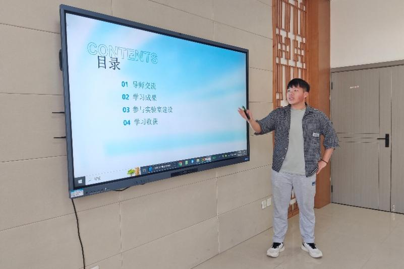 随后,每位员工按照抽签顺序依次进行5分钟PPT展示,内容主要包含导师交流、学习成果、参与实验室建设、学习收获四个方面。